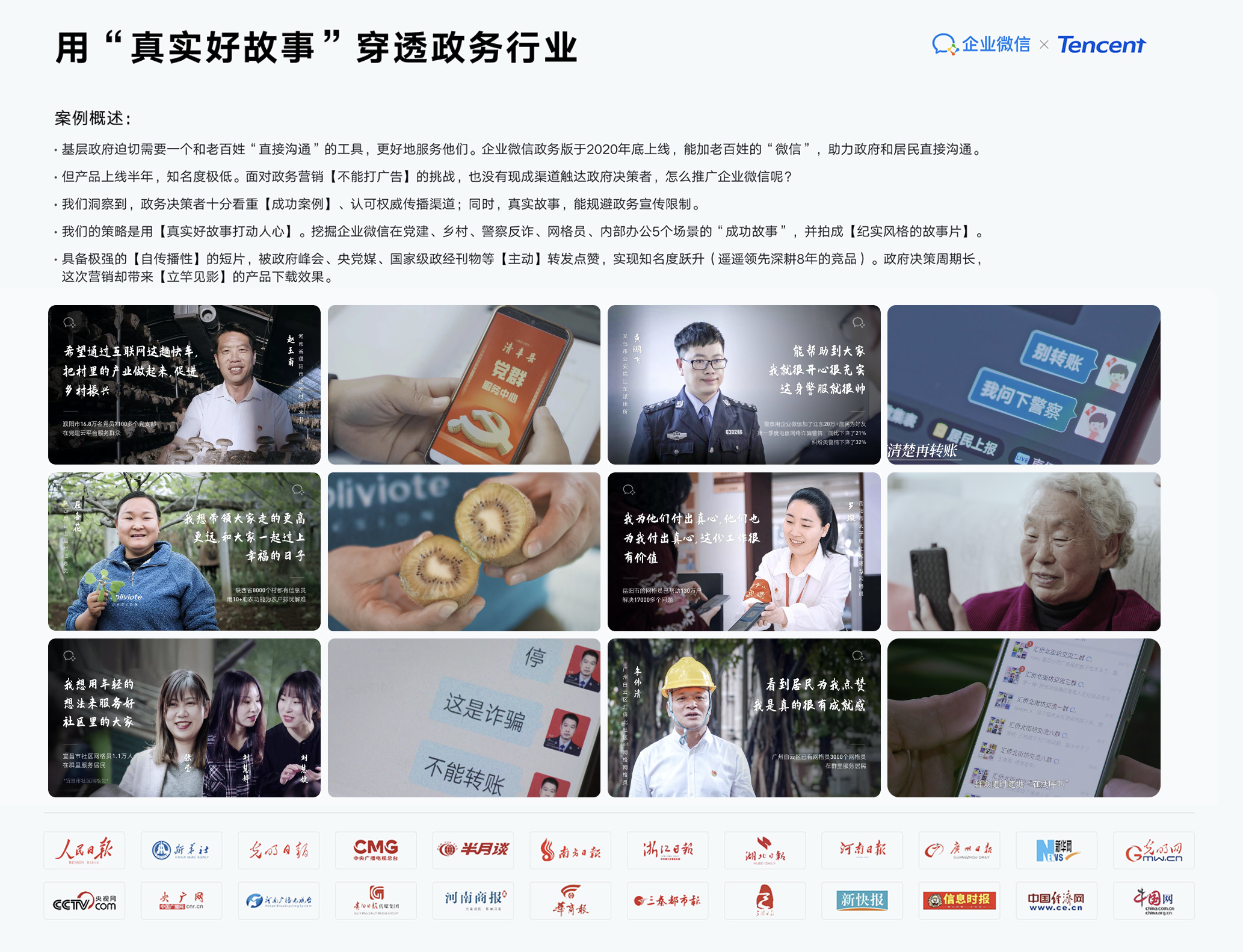 我们的策略是用【真实好故事打动人心】。挖掘企业微信在党建、乡村、警察反诈、网格员、内部办公5个场景的“成功故事”,并拍成【纪实风格的故事片】。