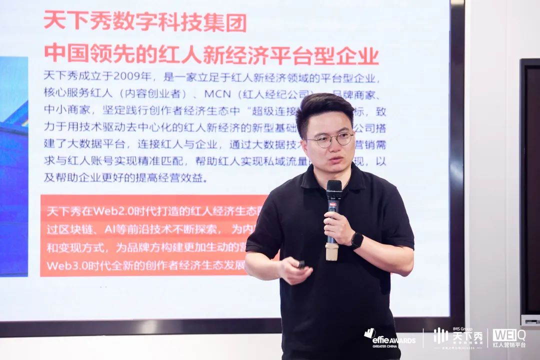 天下秀数字科技集团市场部负责人苏书明在发言中表示:“天下秀WEIQ作为创作者与商家的‘超级连接器’,以内容创新为纽带,双向赋能品牌与红人。同时,天下秀发力布局元宇宙,开启了AIGC领域探索,助力品牌和红人更好地实现内容孵化。希望在今年,天下秀WEIQ携手大中华区艾菲,可以在全新技术的变革中,实现商业价值稳健增长,为品牌在内容创新和营销实践上打造更多元平台。”