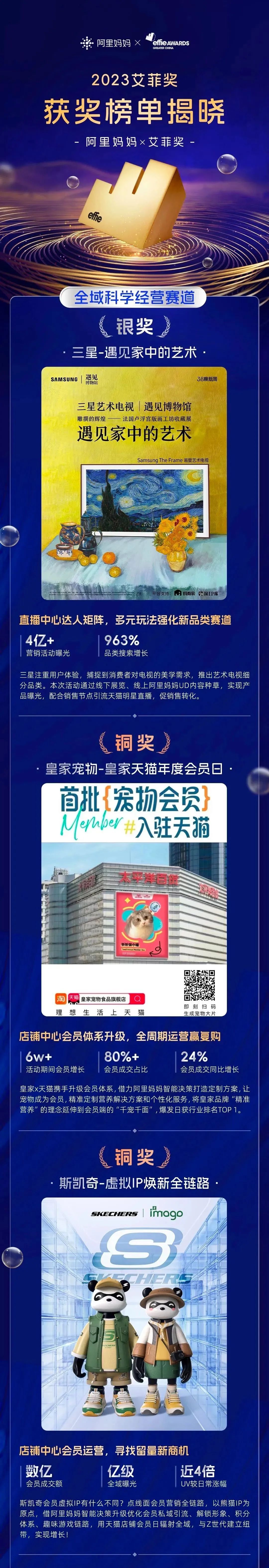激烈角逐中,29个应用阿里妈妈数智策略或产品的品牌成功入围。其中,三星凭借直播中心达人矩阵的成功构建摘得银奖,皇家宠物、斯凯奇以高效会员运营获得铜奖,展现了数字生态领域新趋势和科学经营践行商业增长的前沿策略。