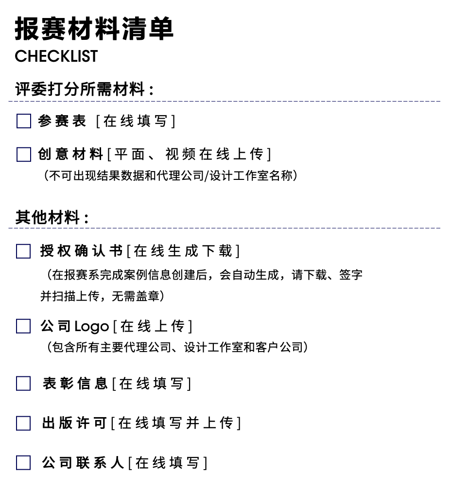 *参赛表及创意材料中不得出现:代理公司/设计工作室名称logo及结果数据。