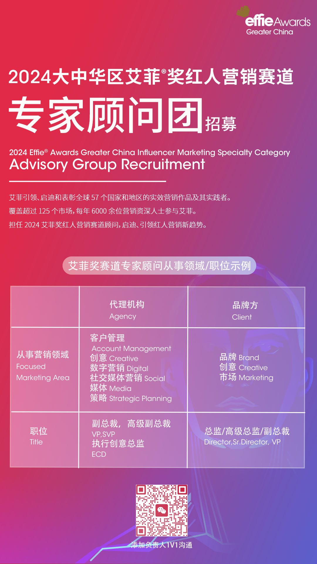 参与赛事建设 受邀担任评委 参与圈层活动 闭门私享会 评审会 国际论坛 颁奖典礼 走进企业 CXO闭门会 与国际奖项同行 1.红人生态内的企业营销或销售负责人、业内资深营销专家; 2.具有大中华地区(大陆、港、澳、台)至少一个地区或以上的多年市场经验; 3.积极参与2024艾菲红人营销赛道案例征集。
