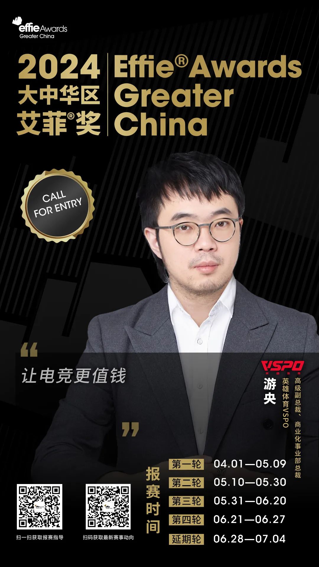 2024年大中华区艾菲奖招赛火热进行中,作为2024年大中华区艾菲奖电竞营销赛道的战略合作伙伴,来自英雄体育VSPO的高级副总裁、商业化事业部总裁游央先生,分享了他对电竞发展的期待。我们共同期待在今年的赛事中发掘更多优秀的电竞营销作品,进一步探索电竞赋能品牌的多样玩法和实效价值。