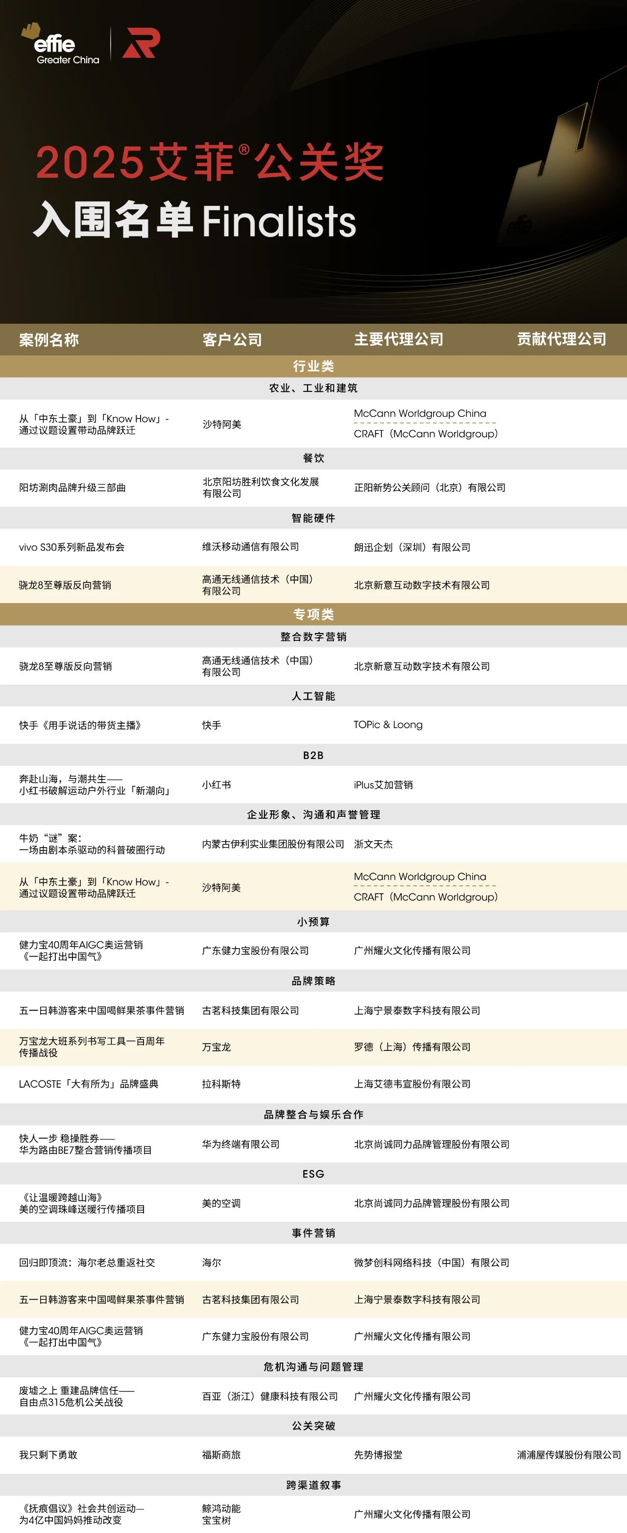 2025年艾菲公关奖(Effie PR Awards)自4月1日开启招赛至7月22日截止,案例征集圆满收官。艾菲公关奖始终聚焦公关传播卓越成就,以实效为标杆,表彰助力品牌打造、信任创建及业务增长的杰出公关作品和实践者。感谢所有参赛公司的支持!