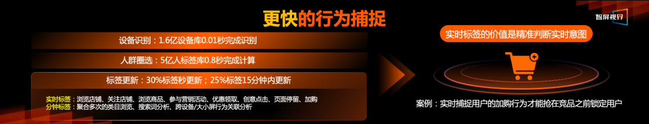 「智屏视界」首次实现了大屏营销从策略到验证的完整闭环。在投前阶段,平台基于电视淘宝大数据进行人群精准定向,快速锁定目标客群;在投中阶段,依托实时用户行为捕捉能力,平台能够在0.8秒内完成5亿人标签库的圈选计算,0.01秒完成1.6亿设备识别,并支持30%标签秒级更新、25%标签15分钟内刷新,实时响应用户“浏览店铺”、“参与活动”、“加购商品”等高价值行为,确保在用户意图最强的瞬间完成有效触达。