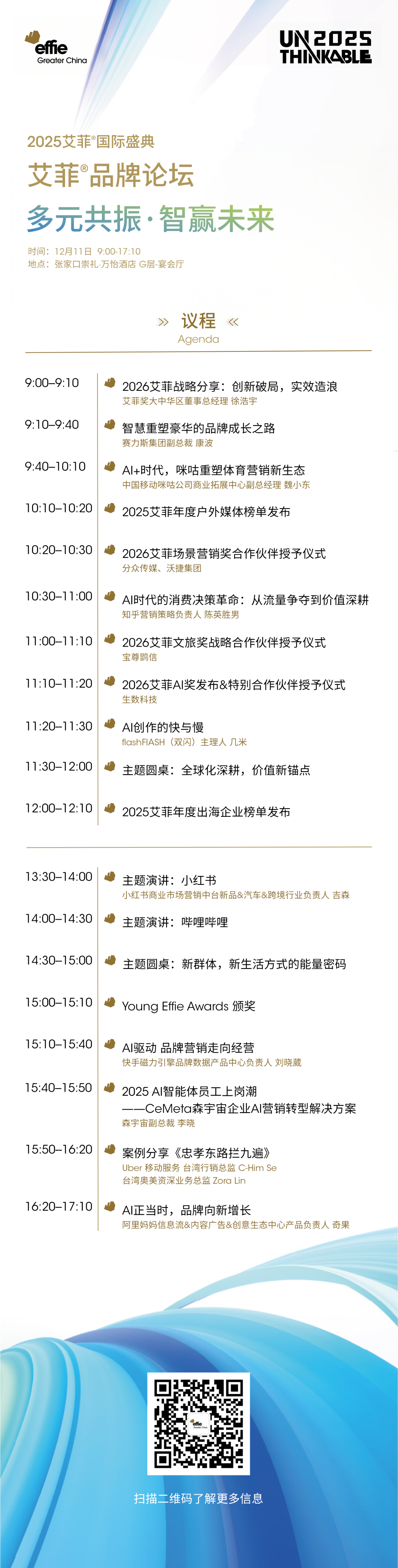 多元共振·智赢未来 2025艾菲品牌论坛将于12月11日携手行业伙伴,立足实战经验与深度思考,打造高价值实效对话,聚焦多元营销创新,挖掘商业变革核心动能,为行业探索新发展路径。
