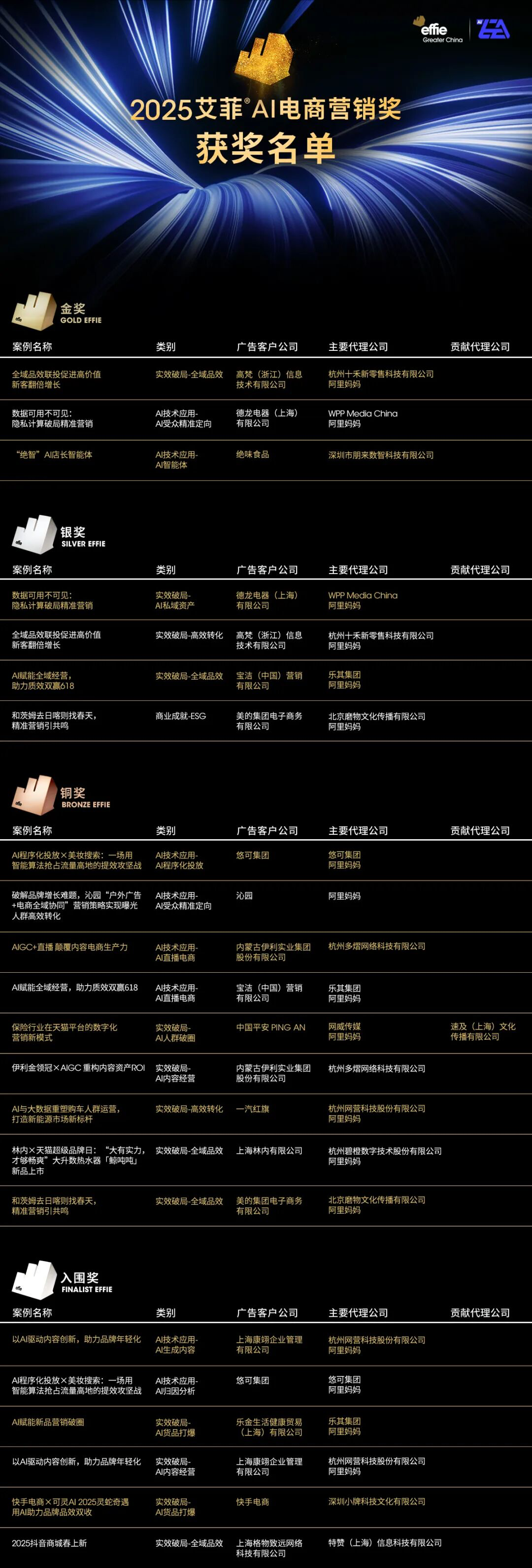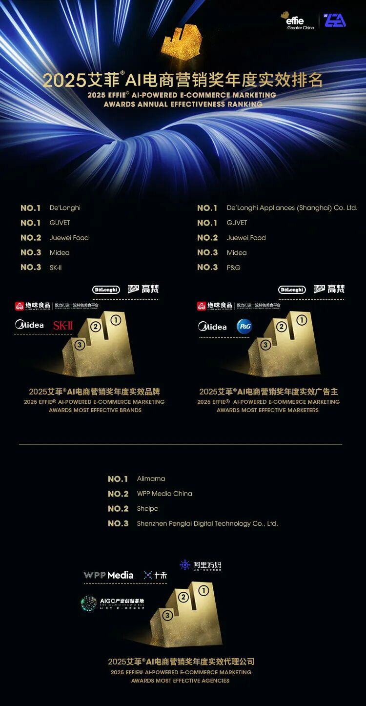 12月11日,2025艾菲AI电商营销奖获奖名单及实效排名揭晓!恭喜所有获奖团队!