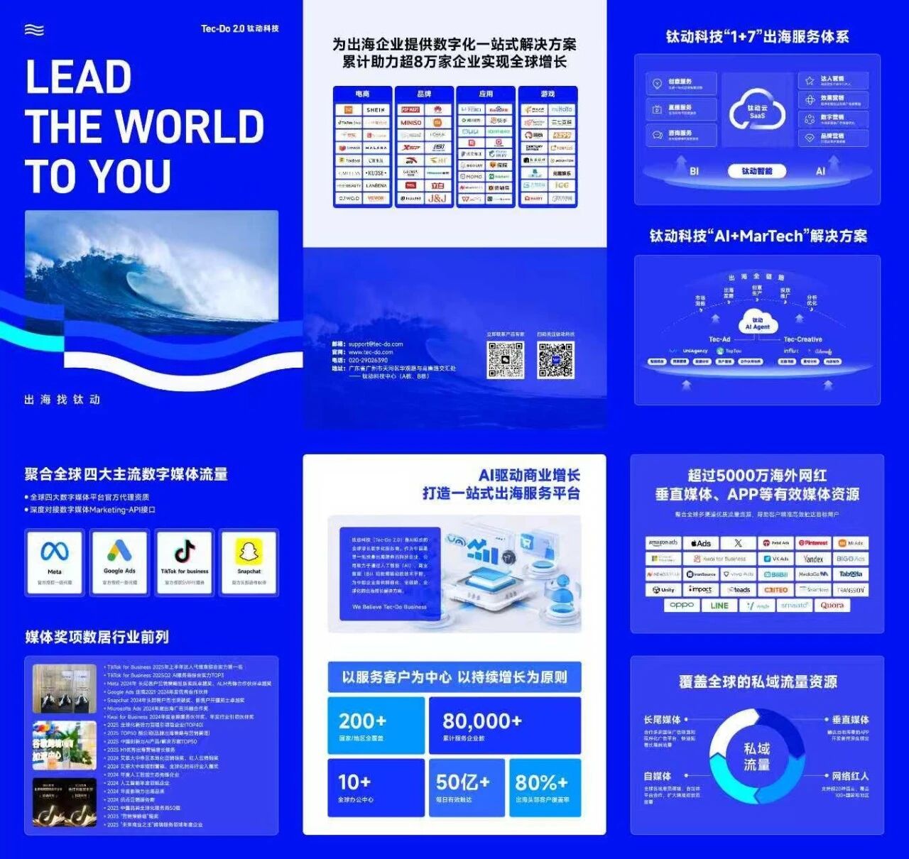 钛动科技融合前沿智能技术与全域数据能力,公司构建了以Martech Multi-Agent——Navos AI Agent为核心的产品技术体系,打造了覆盖策略规划、内容生成与智能触达的一站式增长方案,满足不同发展阶段企业的多元化需求。钛动科技业务覆盖超200个国家和地区,整合链接了包括Meta、Google、TikTok、Snapchat等全球主流媒体资源及覆盖超过1.9亿达人资源,日均触达用户50亿人次,2025年已服务超10万家广告主,涵盖电商、游戏、文娱、生活服务等领域。