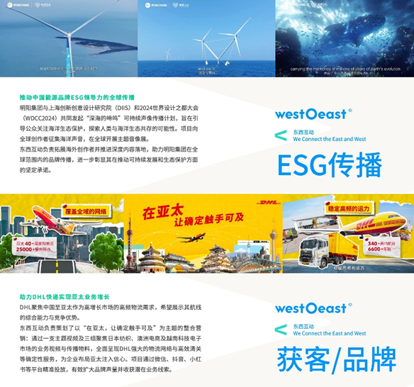 东西互动(westOeast)致力于赋能高价值品牌的全球化征程,构建覆盖策划、生产、分发、获取与再传播全流程的内容营销系统,驱动品牌在全球多元市场的精准落地与持续增长。布局于中国、加拿大、美国、欧洲、巴拿马等多地,东西互动拥有一支在营销各领域经验丰富的专家团队,并在多个国家和地区建立了深谙跨文化沟通的在地服务网络,协同完善的合作伙伴生态,为客户提供高效敏捷的落地支持。同时,作为国内首家获得B Corp认证的营销机构,东西互动善于将ESG基因融入品牌增长方案,帮助客户构建负责任的世界公民形象,带来更坚实的市场信任和商机转化。