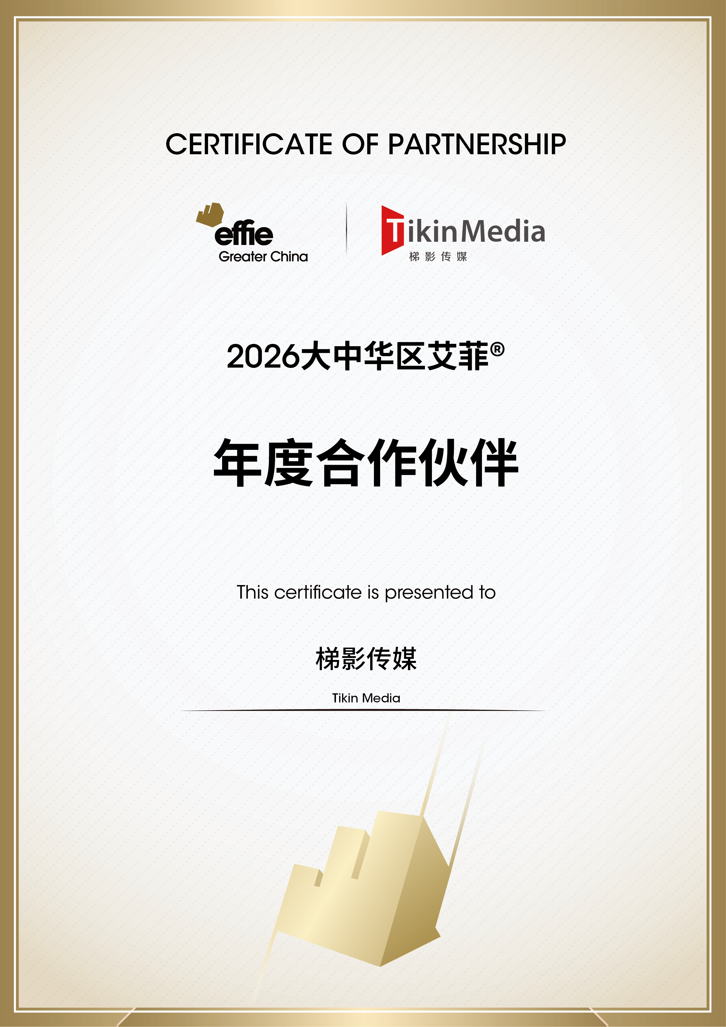 全球艾菲(Effie Worldwide)致力于通过奖项和实效营销的一流见解,引领、启迪和表彰125+国家和地区的实效营销作品以及实践者。大中华区艾菲(Effie Greater China)秉承全球艾菲核心理念,以创新驱动为支撑,立足大中华区市场发展实况,以多元奖项拓展商业边界,以垂直赛道赋能合作生态,以实效引导市场业务创新,驱动行业健康、快速发展。在此官宣2026大中华区艾菲年度合作伙伴梯影传媒,再度携手梯影传媒聚焦实效营销创新发展。