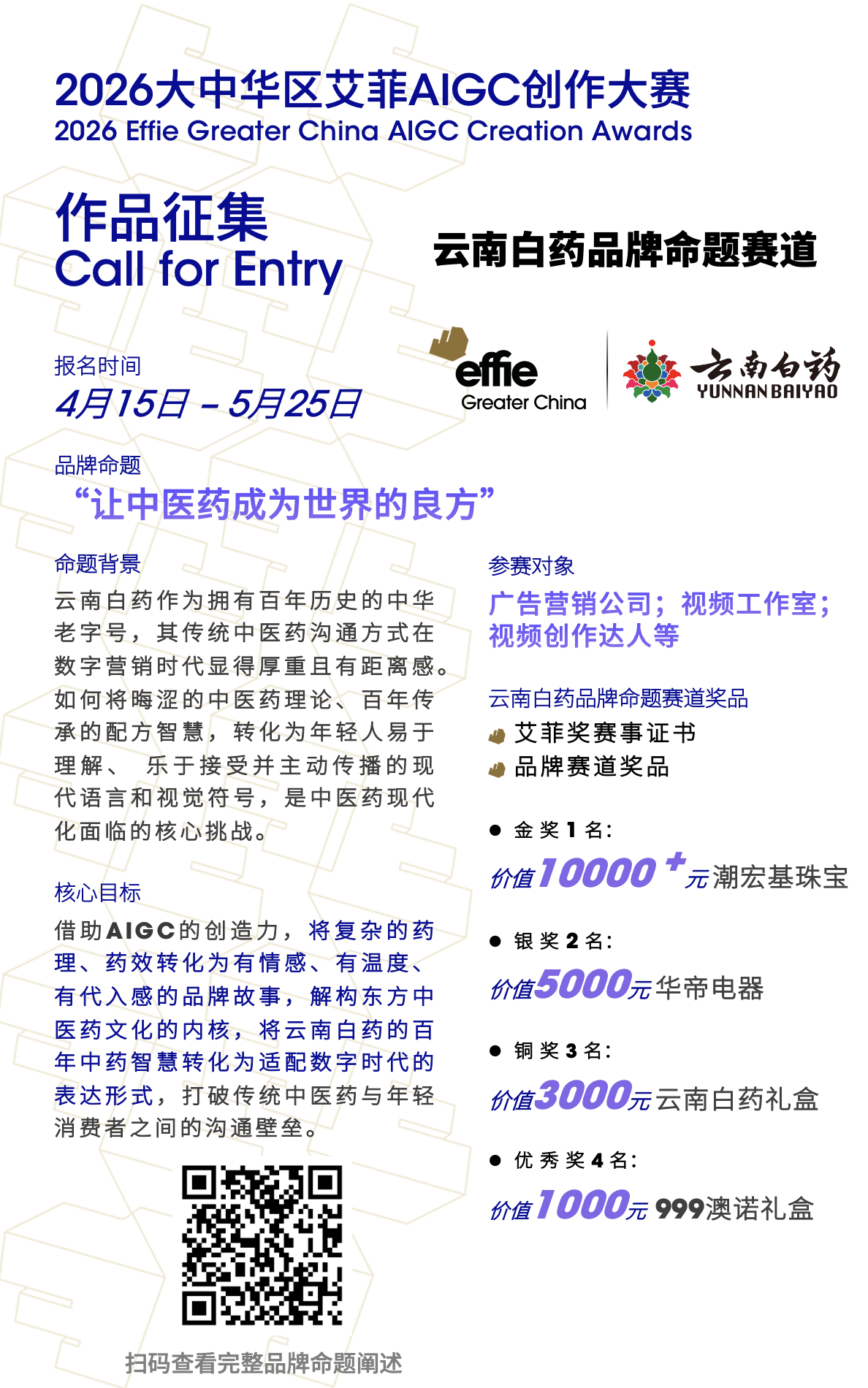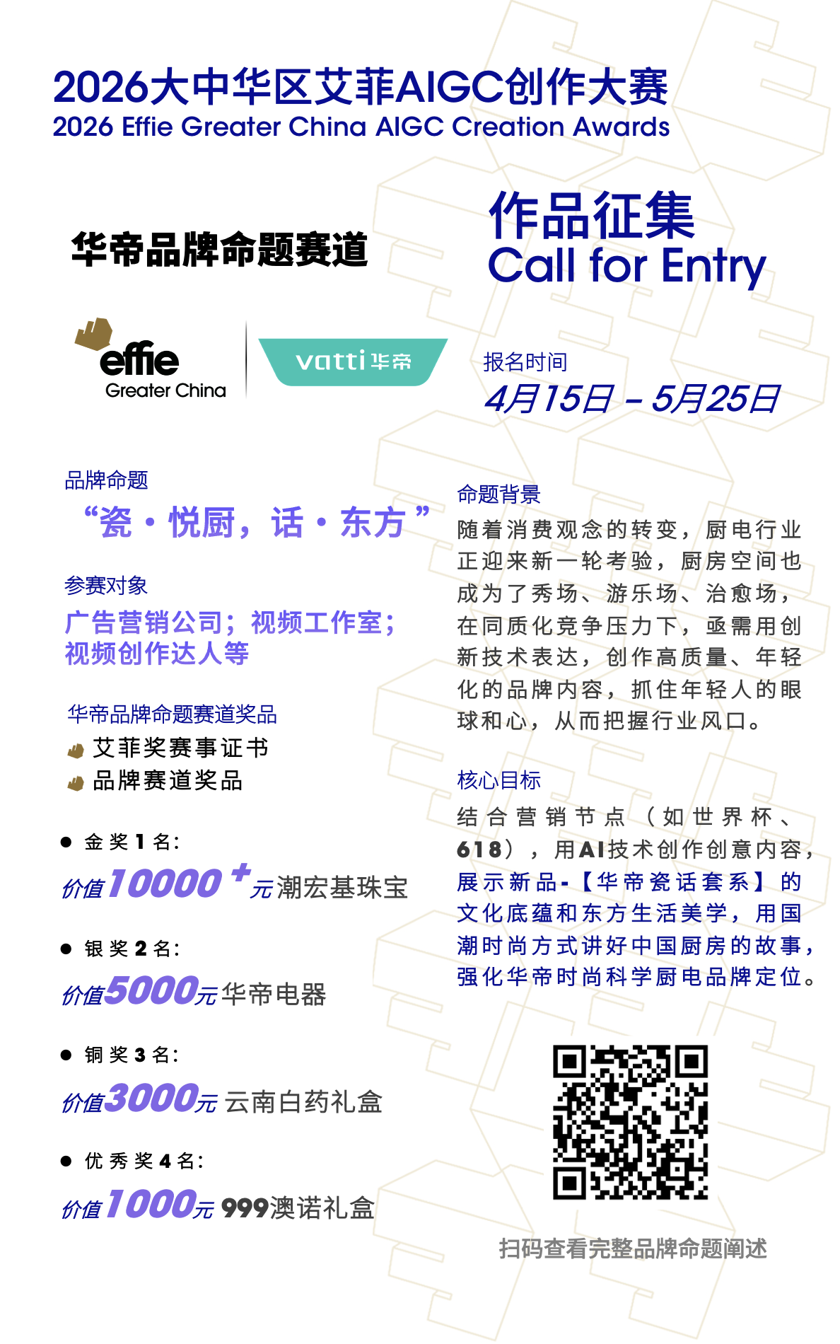 当AIGC技术重塑内容创作底层逻辑,一场覆盖广告营销、影视创作、电商传播等行业的产业变革已然来临。 艾菲首个深度聚焦AIGC创作领域的实效大奖——2026大中华区艾菲AIGC创作大赛(2026 Effie Greater China AIGC Creation Awards) 将于4月15日正式开赛! 本次大赛采用品牌命题模式,「品牌合作伙伴」华帝、云南白药发布品牌命题! 华帝——定位时尚科学厨电品牌,以“好用·好看·好清洁”的标准为纲领,率先提出“净洁厨房体系”,深度聚焦“好清洁”技术做产品创新。 云南白药——源自中国云南的百年中华老字号品牌,以“守护生命与健康”为使命,矢志成为领先的医药健康综合解决方案提供商,持续为大众健康保驾护航。 在AIGC的赋能下,华帝将如何以智能科技重构厨房场景,让千年烹饪文化与未来生活美学完美共舞?云南白药又将怎样用数字力量激活百年秘方,来谱写东方智慧的新篇章? 期待携手行业,共同交付AIGC赋能市场营销的完美答卷! 华帝品牌命题 云南白药品牌命题 2026大中华区艾菲AIGC创作大赛 招赛即将开启 2026大中华区艾菲AIGC创作大赛的舞台已为您搭建,我们期待着今年能涌现出更多令人惊艳的作品。并肩驰骋AIGC浪潮,以智创共绘辉煌!4月15日,大赛启幕,速来参与! 参赛对象:包括广告营销机构、视频工作室在内的专业营销公司,以及资深影视创作者、对AIGC感兴趣的创作达人。 奖励机制:大赛将为获奖单位或个人颁发「2026大中华区艾菲AIGC创作大赛」等级奖获奖证书,并送出丰厚的奖品,期待行业的参与! 赛事日程: 命题品牌路演: 2026年4月 招赛期:2026年4月15日-5月25日 评审期:2026年5月 获奖名单公布:2026年6月 颁奖仪式:2026年12月 *以上日程以实际落地日期为准。 更多大赛信息,欢迎联系: 商务合作:Henry Li 手机:13488697290(微信同号) 邮箱:henry.li@greaterchinaeffie.org 报赛咨询:Julia Zhu 手机:18210275509 (微信同号) 邮箱:julia.zhu@greaterchinaeffie.org
