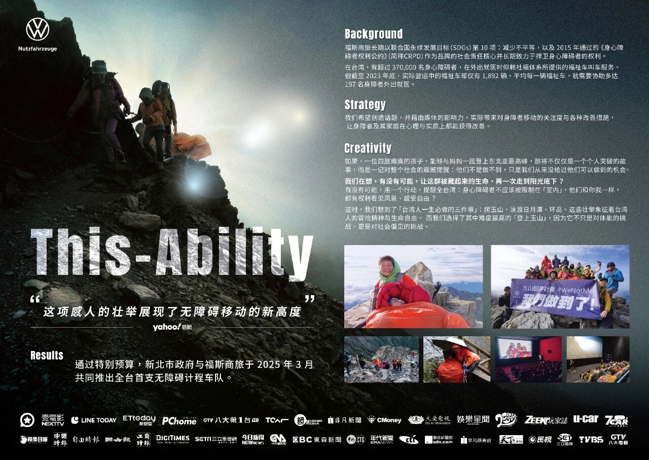 *内容来自报赛单位提交的参赛资料,经报赛单位授权后发布。 案例名称:我只剩下勇敢 获奖类别: 专项类/公关突破 广告客户公司:福斯商旅 主要代理公司:先势博报堂 贡献代理公司:浦浦屋传媒股份有限公司 01 挑战、背景及目标 1.1 背景与挑战 台湾即将迈⼊超⾼龄社会,65岁以上⼈⼝⽐例将超过20% ⾝⼼障碍与⾏动不便者的移动需求⽇益增加,推动台湾福祉⻋市场快速成⻓。根据台湾当地统计,福祉⻋年销量从 2017年的约500台,成⻓⾄2023年约1,500台,但全台平均每197⼈需共享⼀台可载轮椅的⽆障碍⻋辆,显⽰供给明显不⾜。⾝⼼障碍与⾏动不便者的移动需求⽇益增加,推动台湾福祉⻋市场快速成⻓。根据台湾当地统计,福祉⻋年销量从 2017年的约500台,成⻓⾄2023年约1,500台,但全台平均每197⼈需共享⼀台可载轮椅的⽆障碍⻋辆,显⽰供给明显不⾜。 福祉⻋的购买,从来不是价格战场,⽽是信任战场 相较于⼀般乘⽤⻋受景⽓与折扣影响,福祉⻋消费者更重视品牌所传递的安⼼感与社会责任。 人口⽼化推动福祉⻋需求稳定上升 ⼈⼝⽼化推动福祉⻋需求稳定上升。⾯对⽇益扩⼤的市场缺⼝,越来越多⻋⼚与改装商投⼊此领域,显⽰福祉交通已成为重要社会议题与产业发展新趋势。随着福祉交通需求⽇增,各⼤品牌如福特、丰⽥、现代等相继推出专⽤⻋型或与改装⼚合作,积极抢攻市场,但⾼昂的⻋辆与改装成本,仍让多数⾝障者家庭望之却步。对许多⾏动不便者⽽⾔,拥有⼀台专属福祉⻋是遥不可及的奢望,只能仰赖社会福利单位提供的接送服务。 公立与⺠间福祉接送资源有限,加剧⾝障者的移动不平等 公⽴与⺠间福祉接送资源有限,排程不易、时间受限,⽆法真正满⾜⽇常⽣活的实时需求,进⼀步加剧弱势族群的移动不平等。 1.2 目标及KPI概述 企业/品牌目标(必填) 概述:提升福斯商旅的品牌好感度。让福斯商旅成为⼀个能陪着任何⼈⾛出⼾外的品牌,⽽不是⼀个只想卖⻋⼦给他们的品牌。 依据:相较于⼀般乘⽤⻋受景⽓与折扣影响,福祉⻋消费者更重视品牌所传递的安⼼感与社会责任。对多数⾝障者家庭⽽⾔,选择福祉⻋不只是为了移动,更是为了让挚爱⾛出封闭的⽣活。福斯商旅⻓年深耕安全与质量,若能进⼀步转型为「陪伴⾝障者⾛出⼾外、参与社会」的⾏动伙伴,⽽⾮单纯销售⻋辆的品牌,将更能赢得市场与⼈⼼。 衡量:品牌好感度提升 概述:建立品牌与公益项目的正向联结,强化社会责任形象,借助登顶壮举,提升项目发起方及合作伙伴在社会责任领域的声誉和影响力。 依据:本案例的公关目标围绕提升社会对极重度身障者的认知和减少不平等展开。我们设定这些目标,是因为只有打破偏见,才能改变社会对身障者的刻板印象,推动环境与资源的公平改善。通过媒体曝光和舆论引导,激发公众关注与支持,形成社会共鸣,促使政府和企业积极行动。此外,强化品牌的社会责任形象,有助于持续推动公益影响力,实现社会价值最大化。这些目标确保公关活动不仅传播信息,更促成实质社会变革,契合艾菲奖对创新与成效的高标准要求。 衡量:实际带来对⾝障者移动的关注度与各种改善措施 战役/活动目标(必填) 概述:创造话题,让⼈们开始关注⾝障者⾃由移动的权利。打破对「⾝障者只能待在家⾥的刻板印象,提升⾝障者出⾏⾃由的基本权利。 依据:许多企业的公益⾏动常流于形式,难以衡量实质成效,成为短暂曝光下的表⾯参与。然⽽,福斯商旅选择⼀条更有温度也更有挑战的路—不只赞助,更深度投⼊,真正⾛⼊⾝障者的⽣活与需求现场。因为唯有理解,才能改变;唯有⾛⼊社会,公益才有意义。 衡量:实际带来对⾝障者移动的关注度与各种改善措施 02 观点与策略 2.1 目标受众 在台湾有超过370,000名⾝⼼障碍者,外出就医时都需要仰赖社福体制所提供的福祉⻋叫⻋服务。但截⾄2023年底,实际运营的福祉⻋却仅有1,892辆,平均每⼀台福祉⻋,就需要协助197名⾝障者外出就医。 福斯商旅⻓期以联合国的SDGs 10:消除不平等,以及2015年所通过的#⾝⼼障碍者权利公约(简称CRPD)作为品牌的社会责任,我们想要创造话题 ,借由媒体的影响⼒,让⾝障者及其家庭得到⼼⾥与实质的改善。因此,我们的受众分为两个族群: ⾝⼼障碍者与他们的家⼈ : 让他们了解,这个社会并没有忘记他们 30-54岁全体 : 透过尽可能地涵盖多元化的媒体类别,来完整地与社会⼤众进⾏沟通 2.2 阐释洞察 如果⼀位四肢瘫痪的孩⼦,能够与妈妈⼀起登上东北亚最⾼峰,那将不只是个⼈突破的故事,更是⼀记对全社会的震撼提醒:他们不是做不到,只是我们从没给过他们可以做到的机会。 透过这样⼀段艰⾟却真实的旅程,我们想让⼤家看⻅:所谓的「⽆障碍」,不该只存在在⼈⾏道或法条⾥,它应该存在于你我的想法⾥,存在于⼀个社会愿不愿意,让每个⼈都能⾃由移动、勇敢做梦的信念中。 台湾的媒体环境,对企业CSR议题的关注度⼀向不⾼。 公益,往往不是能吸引点击的关键词;品牌做善事,也常常被解读为“别有⽤⼼”。 也正因如此,我们更清楚,如果只是默默付出,这样的声⾳,很可能会在社会的杂⾳中迅速被淹没。 所以,我们选择不再低调,⽽是以⼀个真正有份量、有难度、也有情感张⼒的⾏动来打破沉默。我们希望,⽤这样⼀个⾜够真实、⾜够动⼈的壮举,让媒体⽆法忽视、让社会不得不看⻅。 这不只是为了获得关注,更